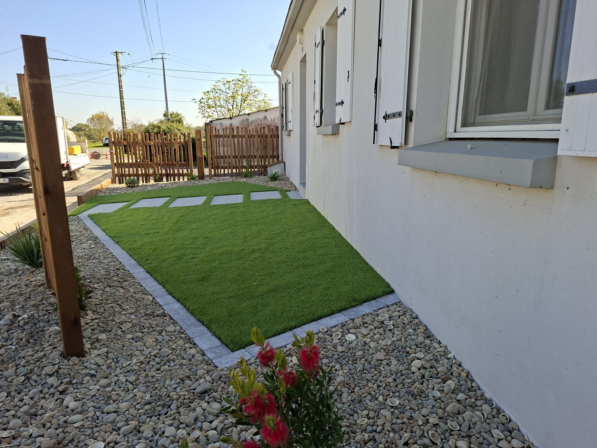 Pose de gazon synthétique et délimitation basse et ajourée en palis de grès et traverses de bois.