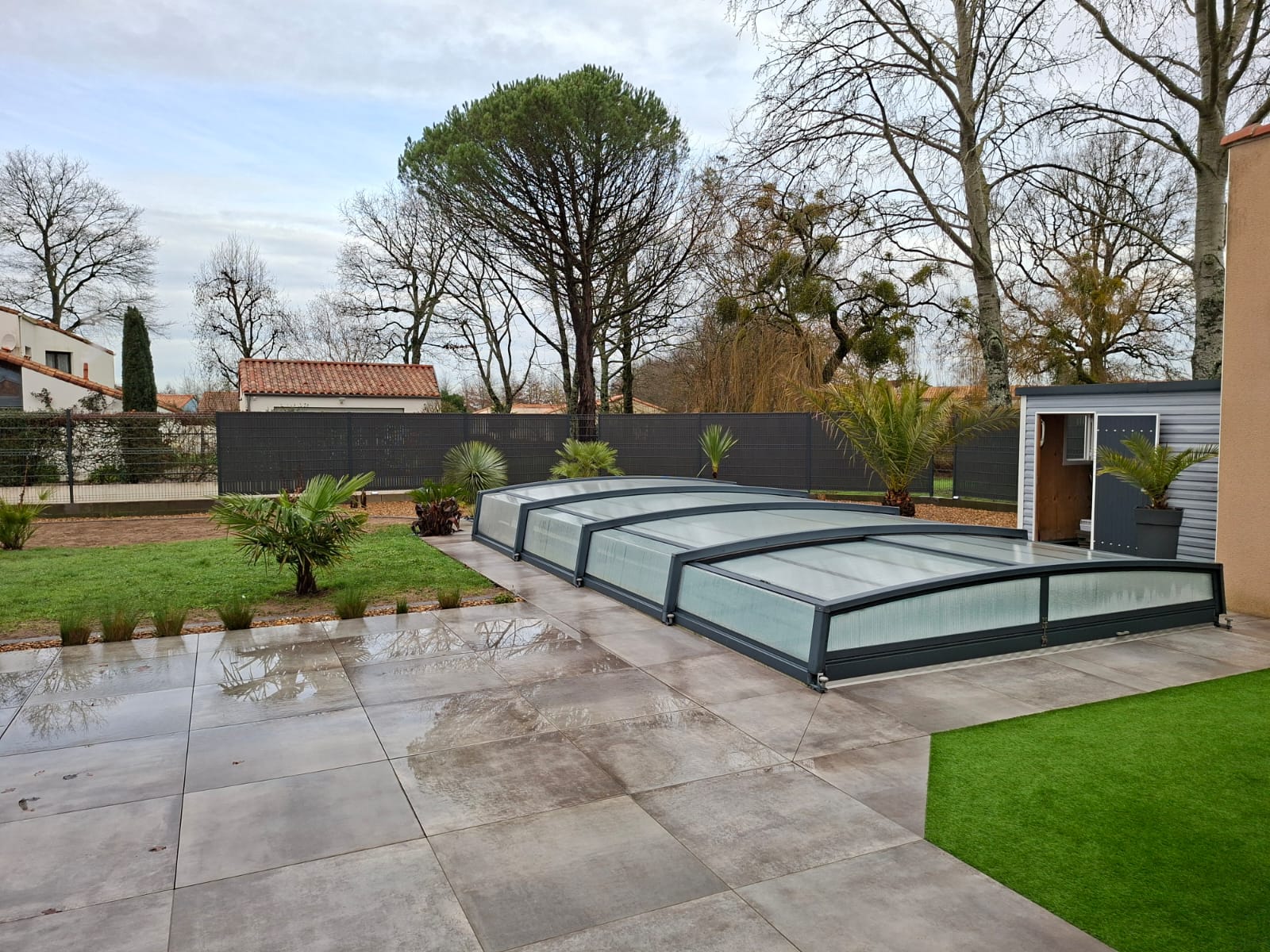 Aménagement avec ardoise, acier corten et gazon synthétique