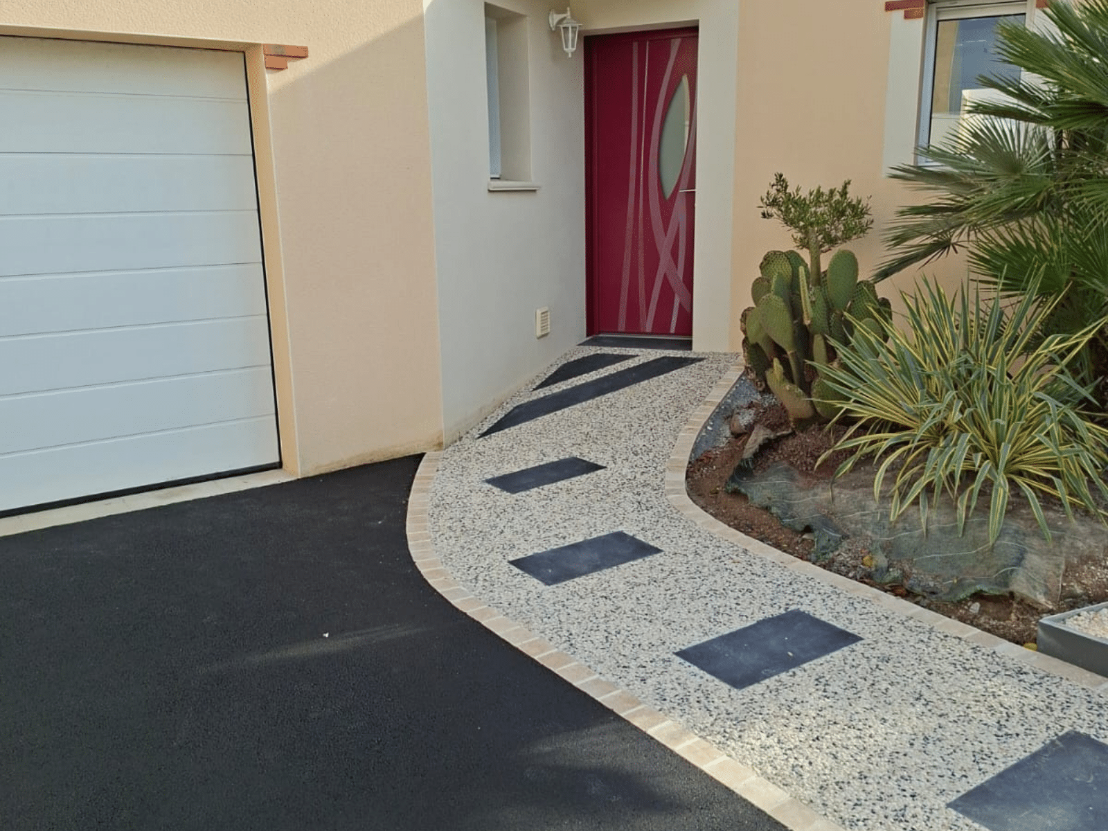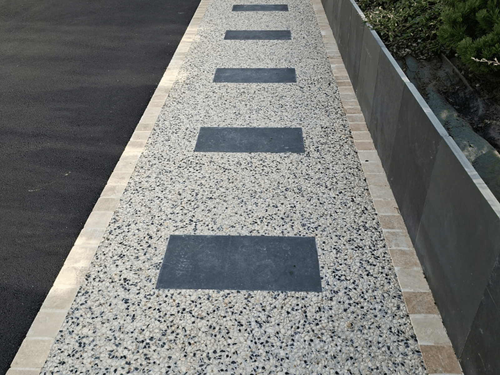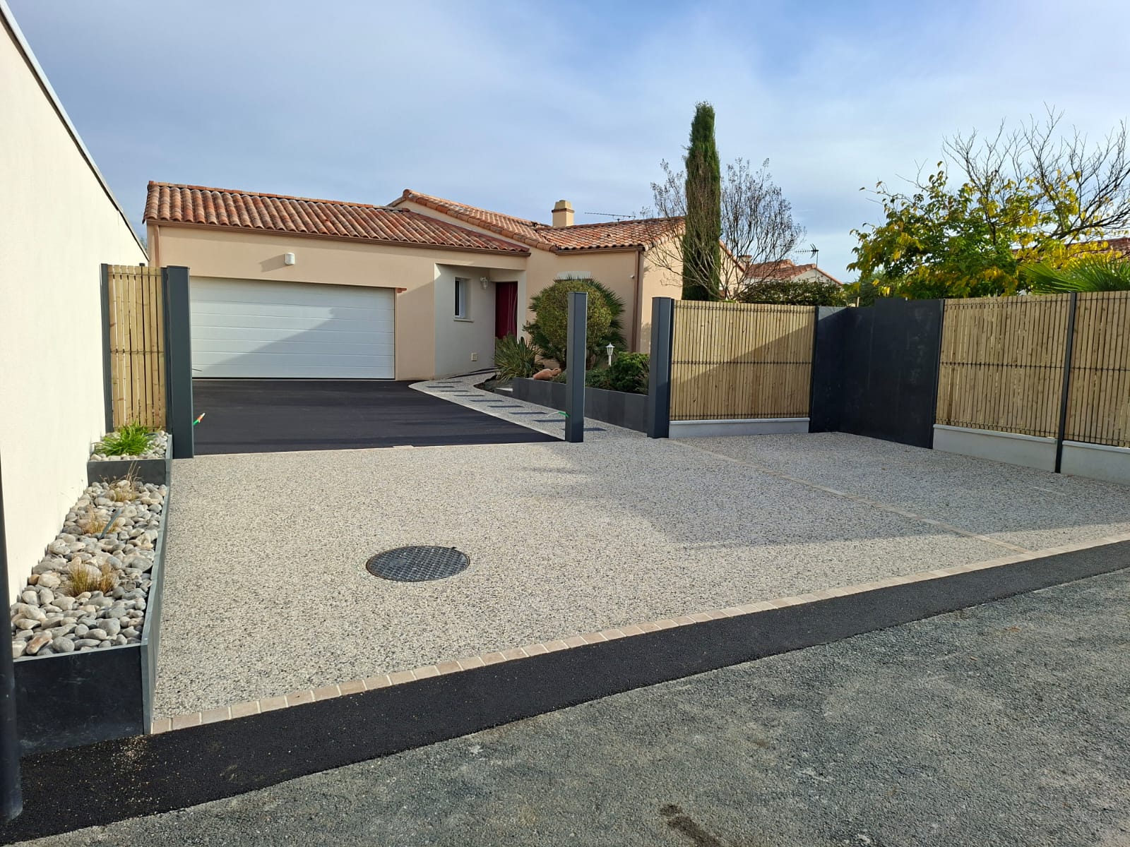Enrobé et béton désactivé. Pavés travertin et clôture ajourée en piquets d'ardoises